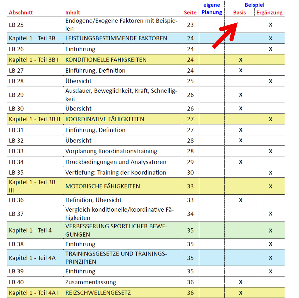 Sportmodelle, Biomechanik/ Bewegungslehre, koordinative Fähigkeiten, konditionelle Fähigkeiten, Trainingsgesetze und -prinzipien.