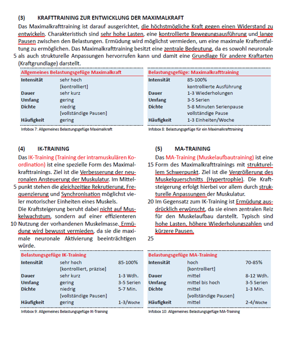 Biologische Grundlagen (Energiequellen und -speicher), Energiegewinnungswege, Trainingsmethoden, Intensitätssteuerung, Trainingseffekte, Ernährung, Gesundheitssport.